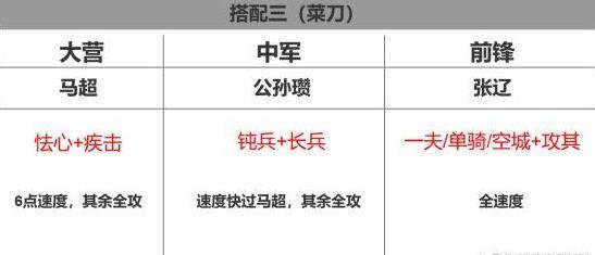 队伍点评:菜刀队,其实就是不占用曹操,解放曹操可以组王异法刀。这队爆发也挺高的,我团就有人用过,爆发比曹操菜刀高,但是稳定性会比曹操差点。公孙瓒也可以全速度,看个人爱好,如果你是公孙瓒全辅助,那么就全速度,如果是作为补位伤害,就加攻击。