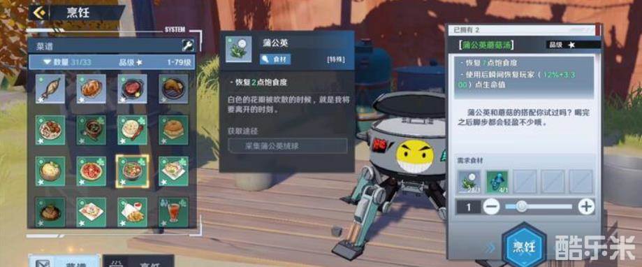 烹饪这个料理的配方为:1蒲公英+1幽灵菇