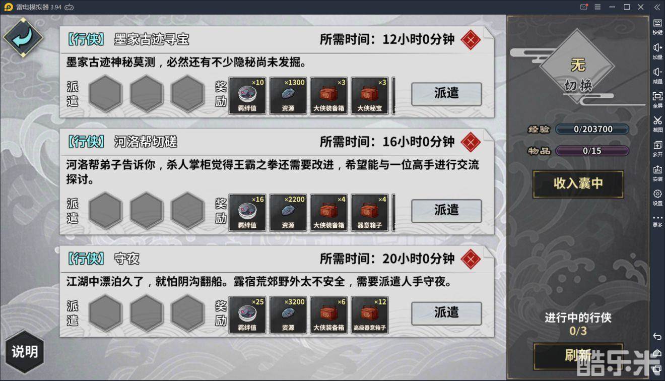 行侠一共分三个时长,分别是12小时,16小时,20小时,一次最多可以派遣3名侠客,多个派遣不减小时间(之前版本的行侠多个派遣是可以缩短行侠时间的)