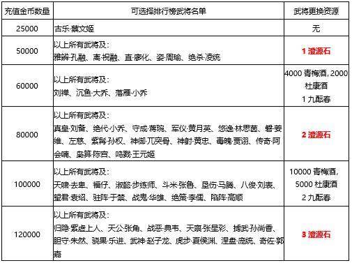 1、活动期间,累计充值金币数量达到对应金额,可以联系在线客服申请1个排行榜武将奖励,或对应金额的进阶酒或澄源石奖励;