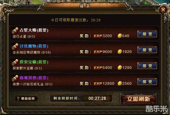 悬赏大厅位于领主城堡内,每天可以领取20个悬赏任务,任务分为5个级别。每个级别的奖励是不一样的。