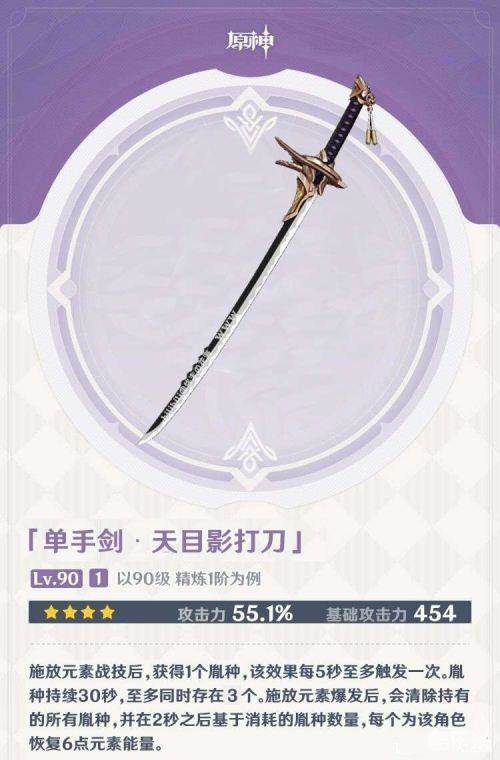 3、新出的四星锻造单手剑,平民玩家值得拥有非常合适,加攻击还能加充能,配个冰系猫猫罗萨莉亚大招也回的很快了。
