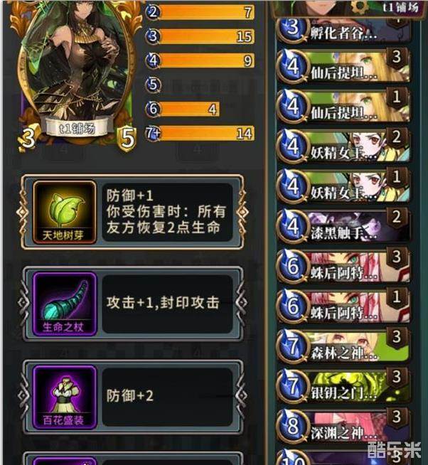 ③妖精奈:目前流行玩法,速攻抗性强后期坚韧,唯一弱点怕【阿萨】。以妖精体系为核心,蜘蛛辅助压场,本体带光环,辅以【蛛后】【森神】【海拉】【优格】【死亡】,放弃启示录和预言家加强压场能力。妖精黑绿是英灵铺场第一职业。
