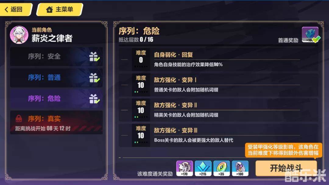 每一位角色相应难度的首次通关均可获取100水晶,难度共分为安全、普通、危险、真实四种,其中真实尚未开放,但根据测试服情况,真实会分为不同难度等级,选择不同难度的怪物BUFF并通关可以获取相应难度的挑战奖励,每周任意角色通关130难度即可获取挑战水晶。