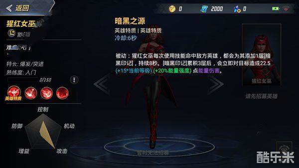 被动:猩红女巫每次使用技能命中敌方英雄,都会为其添加1层[暗黑印记,持续8秒。[暗黑印记]累积3层后,会立即对目标造成22.5(+15*当前等级)(+20%能量强度)点能量伤害。