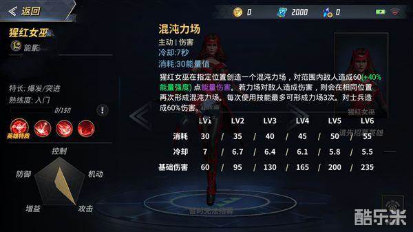 猩红女巫在指定位置创造一个混沌力场,对范围内敌人造成60(+40%能量强度)点能量伤害。若力场对敌人造成伤害,则会在相同位置再次形成混沌力场。每次使用技能最多可形成力场3次。对士兵造成60%伤害。