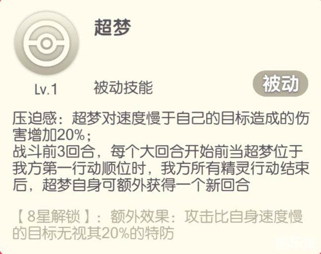 最恶心的在这,超梦的被动,看着好像没啥就是伤害加强20%呗,你听我给你解释,战斗前三回合,每个回合如果超梦是第一个攻击的,那他就会在这个回合结束还能再攻击一次,这样一次还好,但是它的被动有三次机会,这意味着什么,只要你的超梦速度够快,加上超梦的小技能可以吸收200怒气,这就意味着它一回合就能放大招,连着3次,请问有什么宠物能抗住。超梦单挑的神,没有之一。