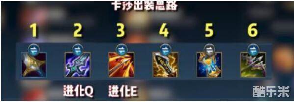 关于卡莎的出装推荐主推攻击、攻速和暴击,一方面提高卡莎的输出能力,一方面尽快的升级技能,下面的出装仅是提供一种思路,每一场游戏局势不同,出装也不同,大家可以自由发挥,当然也可照抄下面的出装,希望对您有帮助呐.