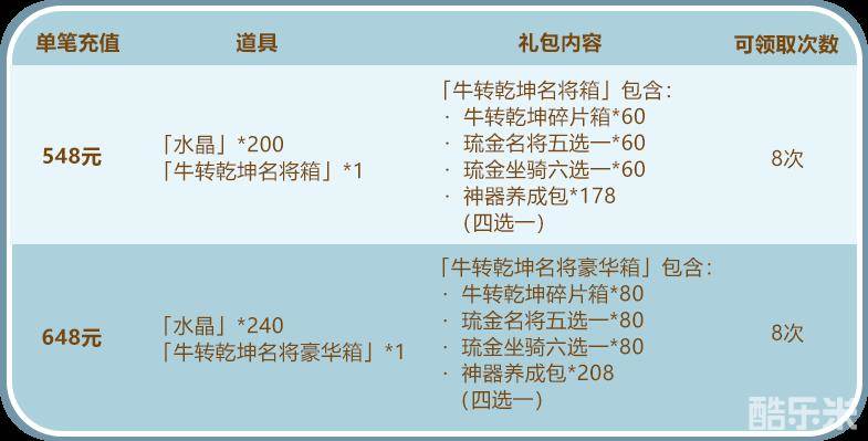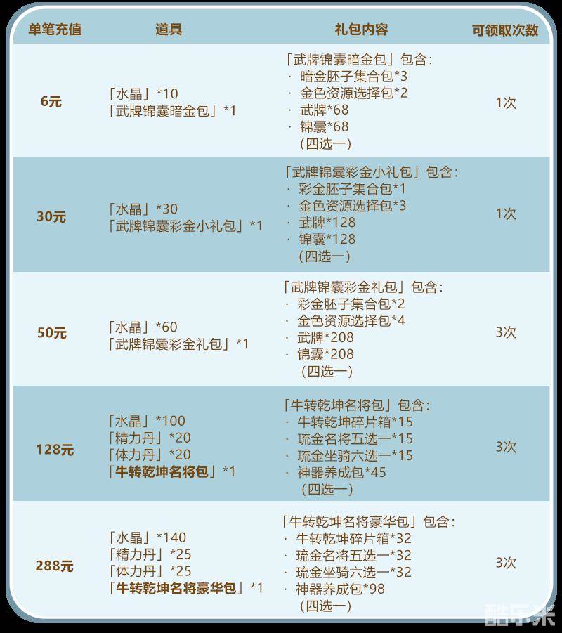 每天充值指定金额即可获得牛转乾坤碎片箱、琉金名将五选一、琉金坐骑六选一、神器养成包珍稀资源,还可以和水晶翻倍的充值活动叠加哦!