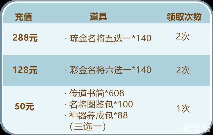 少年们单笔充值指定金额,即可得到琉金名将五选一、彩金名将六选一及丰厚的养成资源!少年们千万不要错过哟~