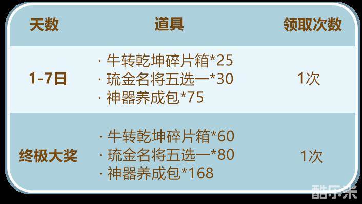 1-7日可领取:「牛转乾坤碎片箱」*25 或 「琉金名将五选一」*30 或「神器养成包」*75