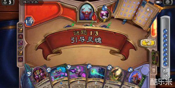 在阵亡士兵第一关,玩家只需要首先打出灵魂剥离,向牌库中洗入灵魂残片,之后打出暗影议会亡灵侍僧,触发战吼,打对面脸3点,就会出现卡死的bug,而退出重进之后可以直接跳过谜题,进入第八关。