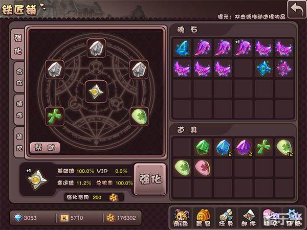 强化到一级;如果你的账号拥有足够强化石那咱们就用三个强化一级石头去就是百分之百100的成功几率去强化,如果石头不够就用咱们就用户2个强化一级石头,不过风险可自己担着啊,很快你会听见清脆的强化成功声音,别高兴的太早,不着急我们接着再强化2级,强化3级,强化4级,只要保持在百分之50以上的几率就可以了,在这里提醒上7之前是几率越高越好,很快你就会强上6了。