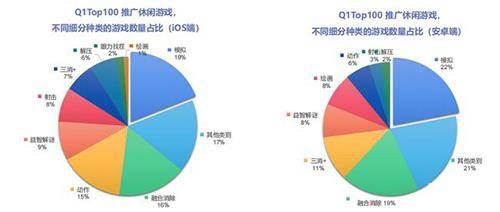 2020年,推广榜Top 100的休闲游戏中,占比最高的是融合消除类玩法(占27%)随后依次是:模拟12%、绘画类11%、益智解谜类9%,三消+8% 、文字类8%和找茬6%。
