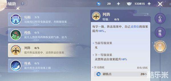 辅助技能目前包括了有幻形、药性、列阵、符术。