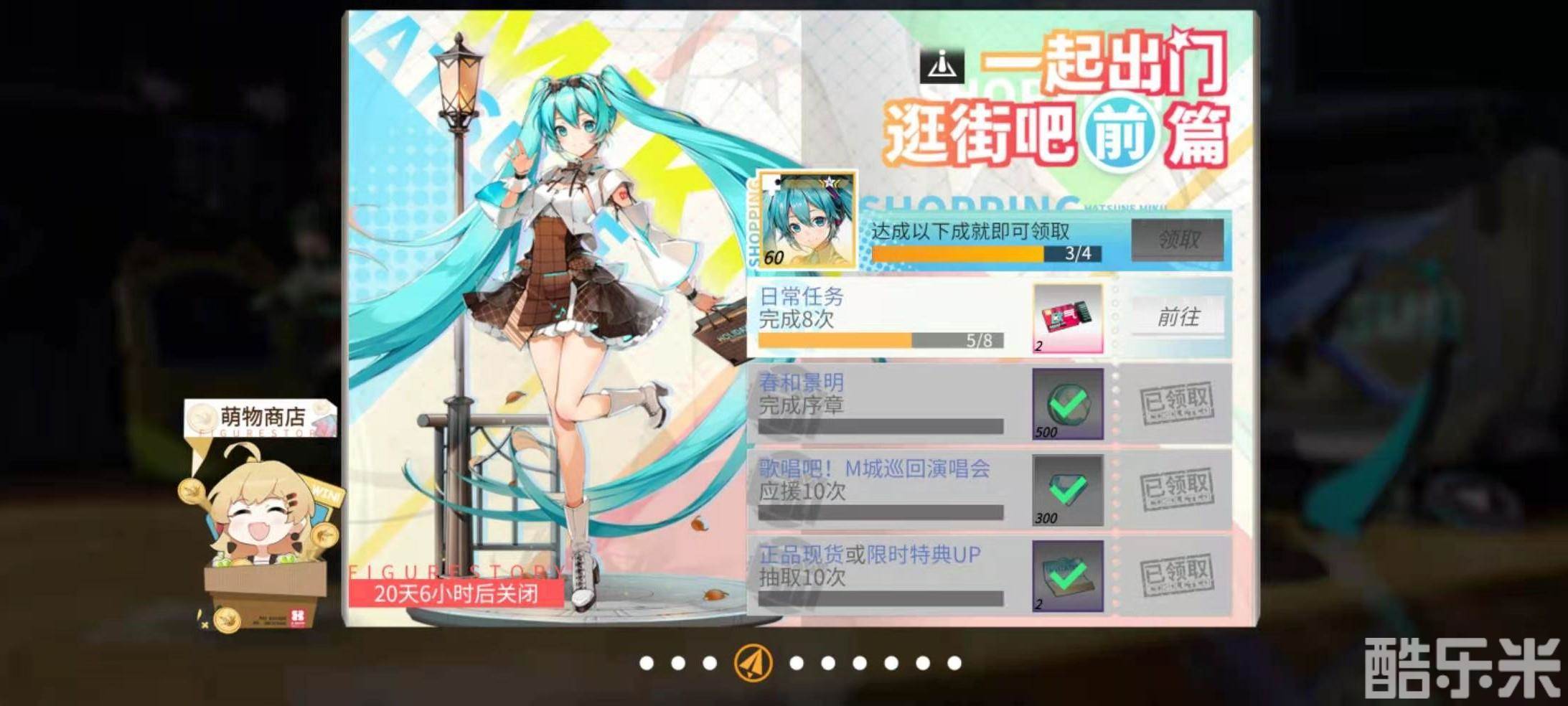 在一起出门逛街吧前篇中完成四个任务就可以获得初音未来碎片60个,也就是可以合成一个初音未来。四个任务分别是完成八次日常任务、完成春和景明序章、在歌唱吧M城巡回演唱会中应援10次、抽卡10次。前两个任务比较常规,后面两个任务需要大家提前收集应援棒和抽卡券。