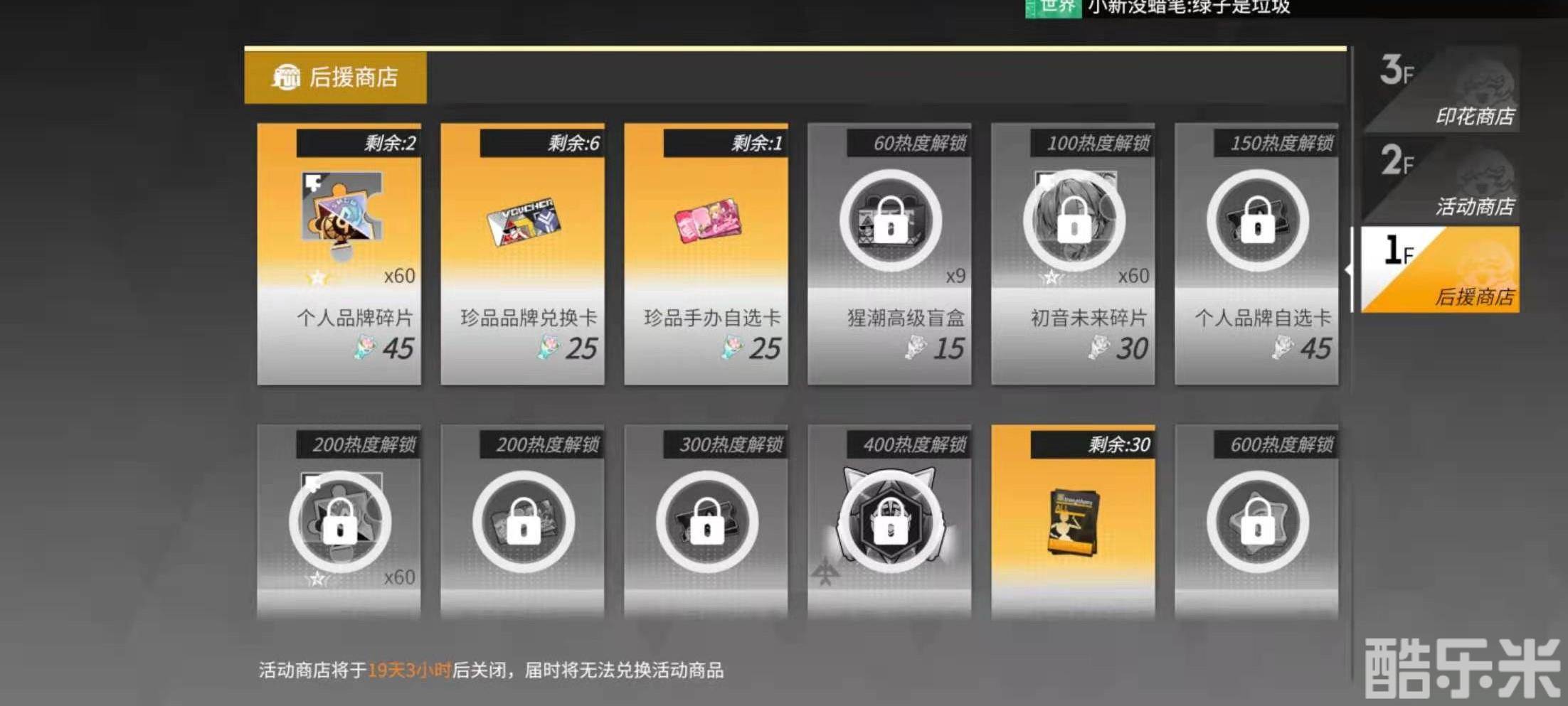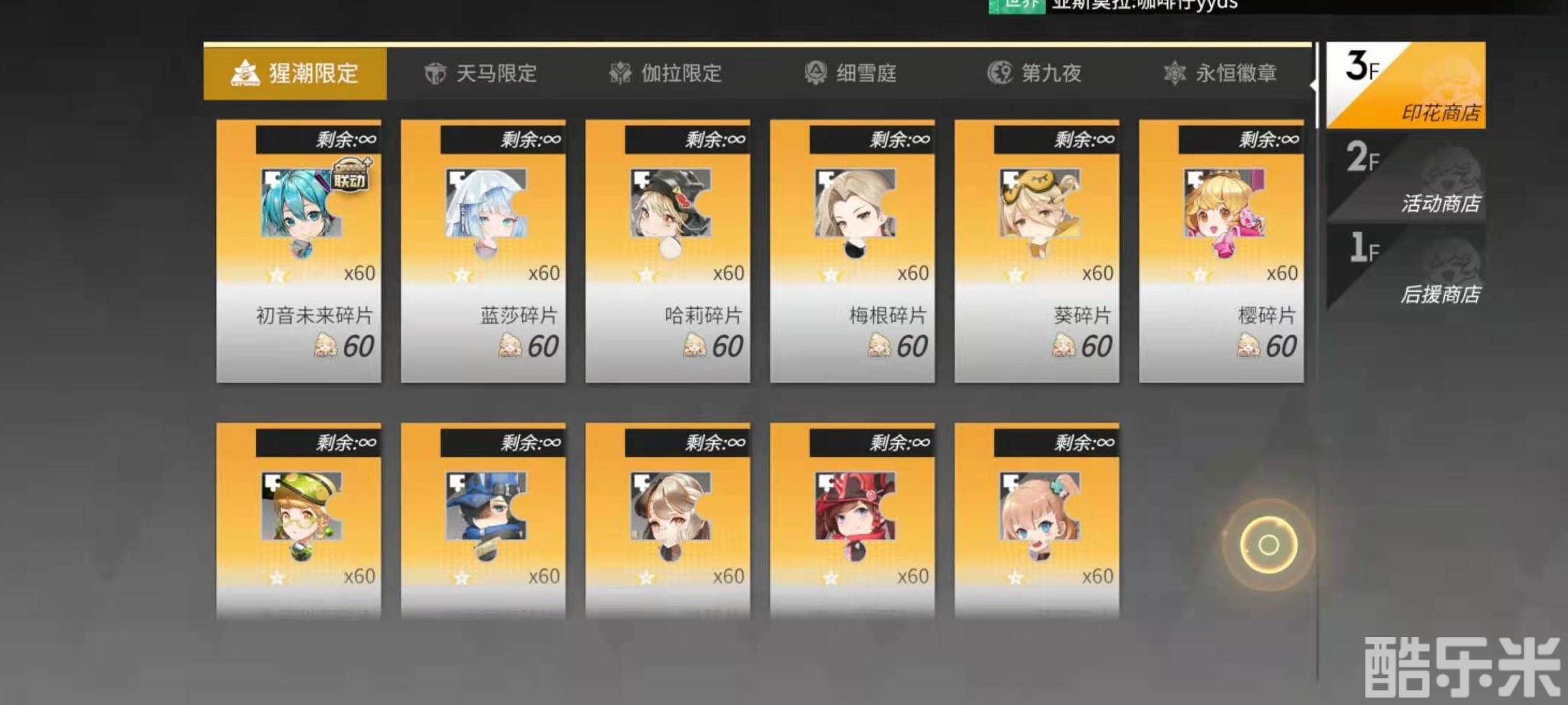 周边印花商店中上线了初音未来碎片60个,可以用60个周边印花货币兑换,周边印花碎片货币可以通过会员充电计划获取也可以通过周运营活动等获取。