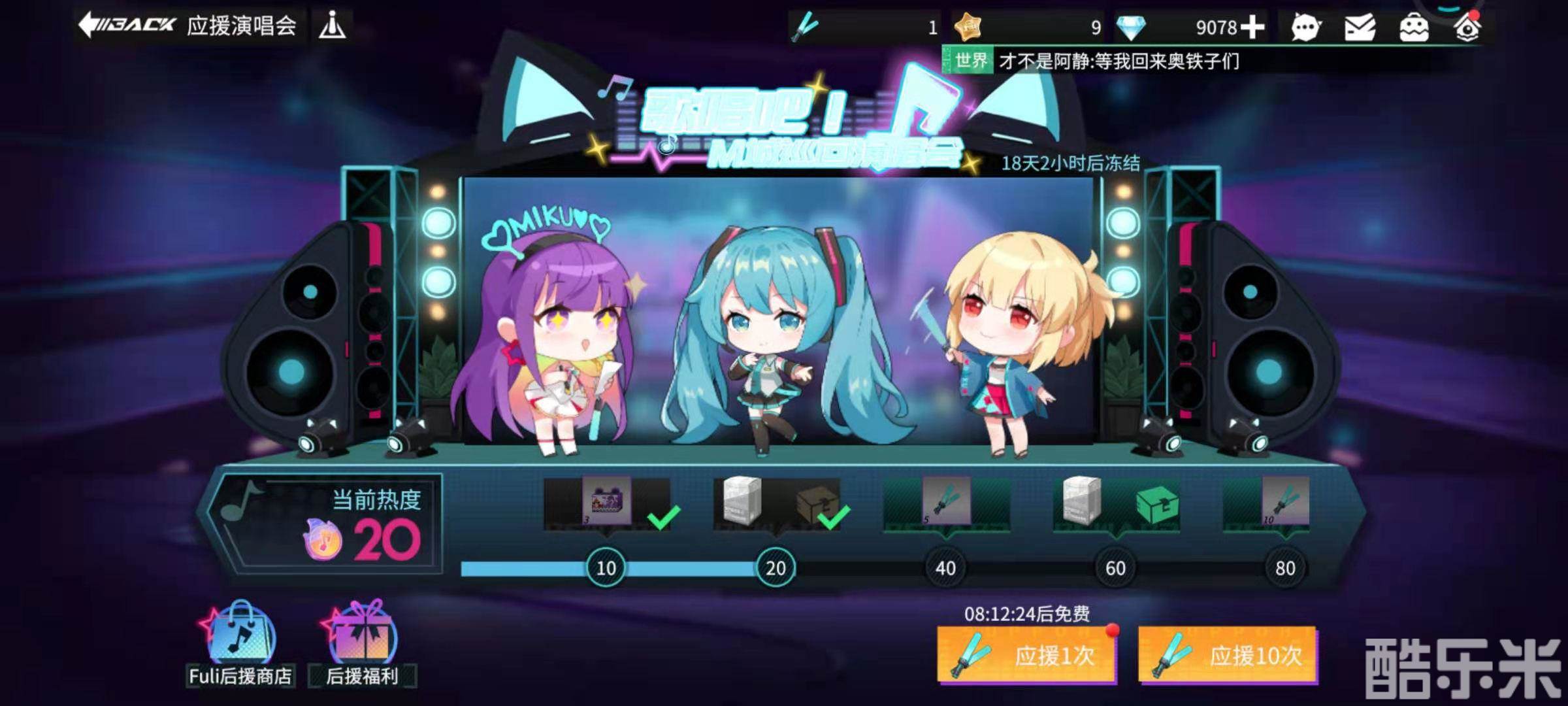 这个活动的核心玩法就是收集应援棒为活动应援人,应援后可以提升演唱会热度,每应援一次提升一点热度,热度增加可以领取相应的礼包,礼包包括猩潮盲盒、珍品盲盒碎片,热度增高之后还可以选购专属特别款皮肤。