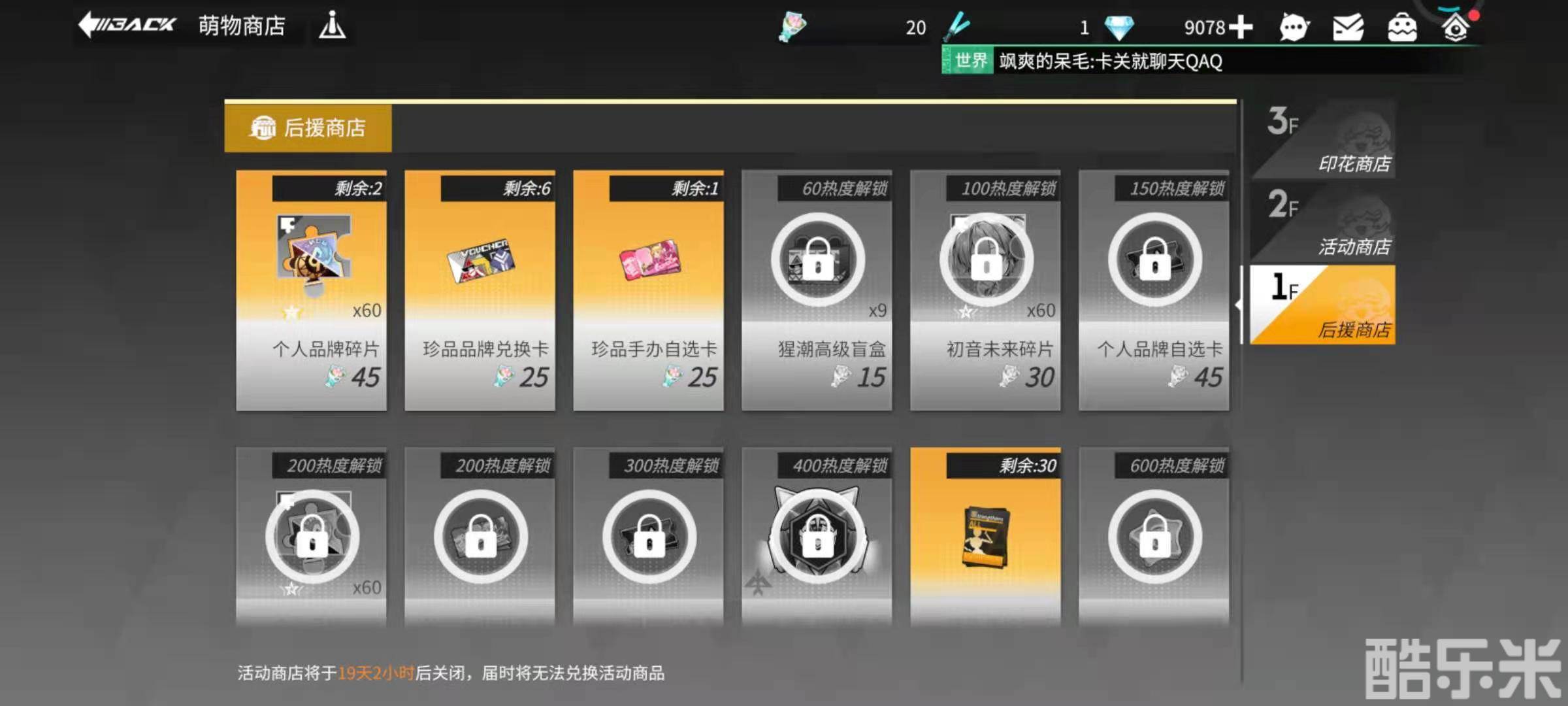 这次商店可以兑换的礼品可以说是非常良心了,因为可以用45个感谢花束领取到60个个人品牌的碎片,也就是可以获得一款细雪庭或者第九夜的珍品手办,是平时抽卡很难获取的,所以如果是想要收集手办的小伙伴可以兑换这个,如果想要让初音未来更快升星,可以到热度升到100时用30个感谢花束兑换初音未来碎片。