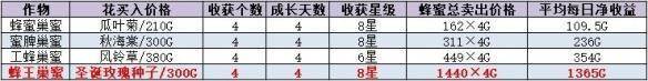二十个蜂箱每四天可以产八十个蜂王巢蜜,加工后卖出,一次可以赚到126800G!而成本不过是6000G而已,相当于一天的净收入就达到了30200