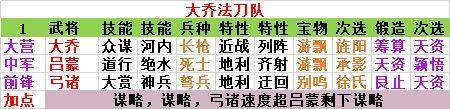 大乔法刀队属于现在大赏神兵最好的队伍,但是需要大乔最少两红以上,没有两红的玩其他队伍,吕蒙弓诸红不红都可以玩。弓诸换曹操,张昭,陈宫等等都可以。这队众谋,大赏和神兵这三个战法不可以换,剩下都可以换。(换成输出战法就行)