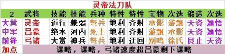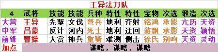 如果你的号武将都是全白板的,这队王异法刀是大赏神兵中最强的队伍。因为王异比较稀有,有的人比较少。白板王异不如上面几队高红的。曹操可以换弓诸或者荀彧,王异弩兵换成长弓就可以。