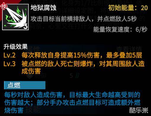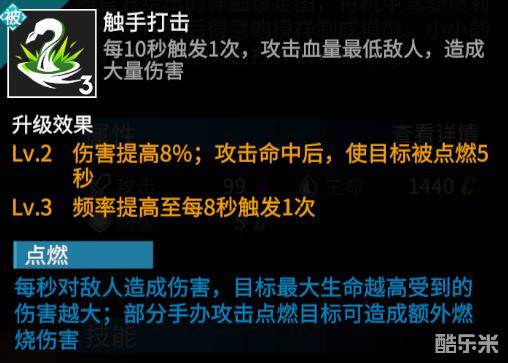 周期触发一次,攻击血量最低敌人,造成大量伤害,可用于残血补刀,配合高爆发前排比如宫本尤娜可以让敌人前排快速减员;配合卡缪被动则可以切敌人后排,灵活性很高。被动升到2级后,使目标被点燃数秒,可以弥补伤害不足,同时也可以配合3级大招造成死亡爆炸的效果。被动升到3级后,触发频率提高,同时提高了总输出能力和点燃能力。