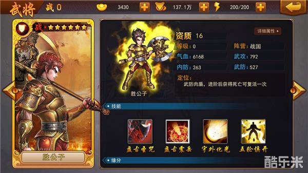 武将胜公子是神将录战国阵营中资质最高的6星武将,外表英俊潇洒,男人嫉妒女人爱。身为战国武防肉盾,进阶后获得死亡可复活一次。作为大神盘古的后代,其技能在武将中首屈一指,特别是盘古圣咒和盘古震岳,一起来看下技能详解!