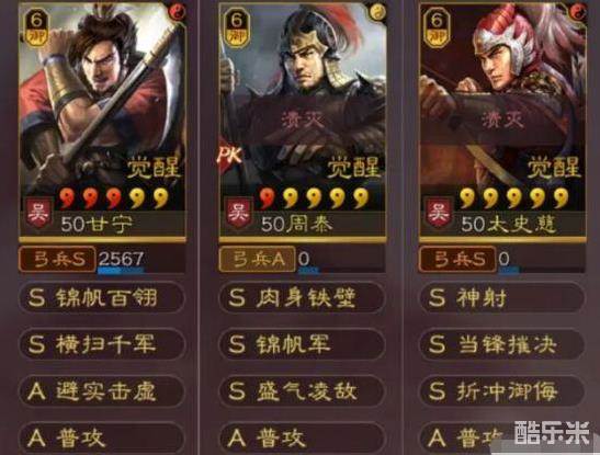 靠甘宁的高会心打伤害,选用无需准备的战法使其快速打出伤害会心,横扫配合盛气高几率可以打出震慑,周泰抗伤增伤提供增益,太史慈对敌军施加负面伪报,技穷,降低敌方统率给其选用的突击战法没什么伤害,所以兵书选择了胜而益强,和藏刀,提高突击战法的发动几率。