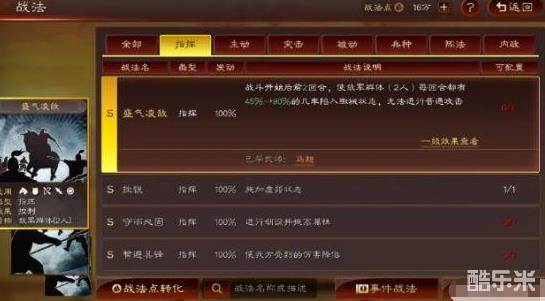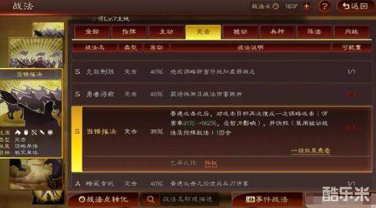 最后是太史慈,我们给其携带的战法是当锋摧决,弯弓饮羽,兵书选择作战,胜而益强,武略,藏刀,加点25武25速。
