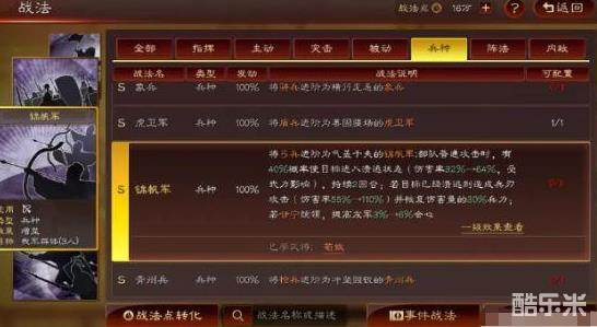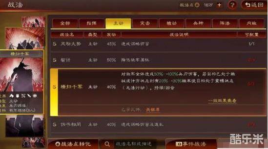 兵书“胜而益强”,使自身在成功发动普通攻击后,有40%概率恢复一定兵力(治疗率65%),武略,提高8%普通攻击伤害,藏刀,自身突击战法伤害降低5%,突击战法发动率提高3%。