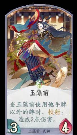 大妖怪玉藻前在对局中的定位是一名法术型式神。三张1勾法术牌都具备了增加玉藻前法术牌伤害的能力,配合中后期的化身效果,还能投射额外伤害,不消耗资源的情况下,威力更胜一筹。可以让玉藻前胜任快攻和后期两种不同节奏的卡组。