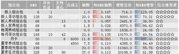 ◆说明2:月卡按满收益30天算,新人家具组合包中的家具零件,后期会严重过剩,故推荐度低,新人期可酌情购买。