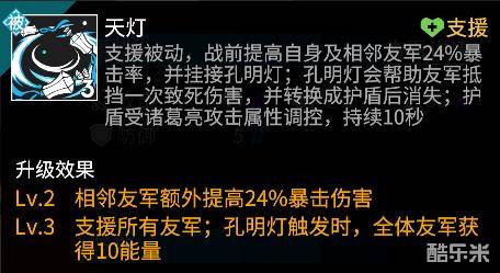 作为细雪庭支援手办,诸葛孔明的被动跟其他支援手办相似,主要以辅助为主;孔明的支援效果主要以暴击和暴击伤害为主,不负输出型支援之名。除此之外,所有被支援的队友还会被七星孔明灯护佑,可抵挡一次致死伤害并获得护盾;如同全员装备荣耀徽章。被动升级后,孔明灯触发时会给全体友军添加能量,在绝境下有机会逆天翻盘;在快节奏的战斗中表现尤其突出,终于不同害怕「月光小公举」了。值得注意的是,诸葛孔明擅长以攻为守,续航能力偏弱,适合搭配具有吸血能力的手办来弥补该缺陷。另外诸葛孔明附加的增益效果不受支援加成属性影响,且治疗能量相对偏弱,跟其他支援同时上阵受到的影响较小。