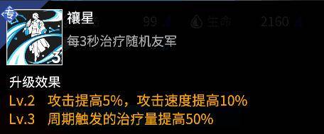 作为支援职业,诸葛孔明在战斗中会周期治疗随机友军,该专属提供的治疗可部分弥补孔明大招只加护盾不回血的缺陷。专属中额外提供了攻击和攻击速度属性,其中攻击属性不仅可提高大招的输出,同时可增加孔明灯的护盾值;而攻速属性可一定程度提高天气效果下的点燃几率;结合诸葛亮大招特征,可谓进攻性十足。诸葛亮的属性调配也主要以追求这两种属性为主。