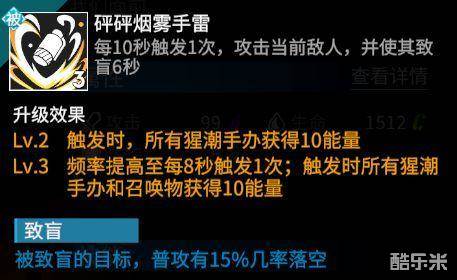 战斗过程中每隔一段时间,哈莉就会朝正在攻击的目标释放一颗烟雾手雷,造成不菲的伤害和持续6秒的致盲效果。被致盲的敌人普攻有一定几率落空,可极大强化我方冲锋手办的闪避几率,血条加满可能只在一瞬间。被动升级后,可提供猩潮手办稀缺的充能能力,有效提高其大招释放频率。该充能对前期流手办还有额外的好处,让前期流手办在樱支援效果消失前大概率可释放除第二次大招。