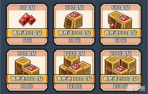 1元兑换10血钻。血钻是氪金货币,玩家可以在充值界面选择不同的充值档位来获取血钻。