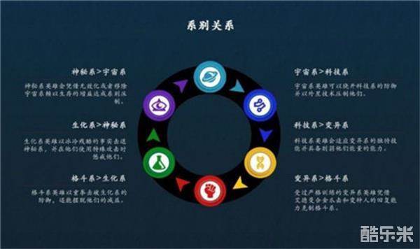 游戏内共计有六个系别,分别是宇宙系、科技系、变异系、格斗系、生化系以及神秘系,具体的克制关系如下: