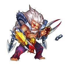 日玄使一头银发,体格强魄,上身裸露,满满的肌肉,足上也没有穿鞋,赤脚踩地。双臂套着两个大剪刃。