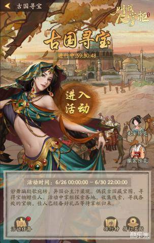 封藏历史尘埃下的古都之国,神秘王朝的消失之迷即将揭晓。她来自一个遥远的强大王朝,尊贵如公主身份,为了破解命运的诅咒踏入中原寻求你的帮助。《叫我大掌柜》全新知己【古国公主】、限量皮肤【古国公主-楼兰女王】华丽登场,想要获得公主的青睐,在掌柜达到十级后,即可通过骆驼参与探索(每探索1次消耗1个骆驼)。每次探索将随机前往一个地点获得宝物线索或道具。当收集的线索达到上限时,即可获得该地区的宝物。需要注意的是,每个宝物均有其固定价值,不同的宝物价值不同,收集到的宝物可用于领取佳人礼。每次探索将获得随机数量的线索,同时进行活动排名,活动结束后可领取丰厚的排名奖励。