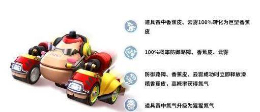 在防御上,电音巨猩还能100%防御路障、香蕉皮、云雾,成功防御的同时,电音巨猩会立即释放滑稽香蕉皮,并且高概率获得氮气!踩中滑稽香蕉皮的玩家会失控打滑。电音巨猩,能防御能骚扰,跑的还贼快,谁用谁知道~