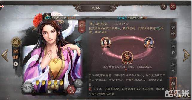 而在三国这个男人的世界中,女性的魅力也被《三国志·战略版》根据历史上的典故呈现的淋漓尽致。虽然貂蝉身为女子不能聚集天下名士在身边辅佐,但是倾国倾城的美貌何尝不是魅力的另一种表现呢?不仅是在小说中,在《汉书通志》也有记载:“曹操未得志,先诱董卓,进刁蝉以惑其君。”看来历史上是确有其事的。尤其是在她一战成名的连环计中,王允的计谋虽然巧妙,但是如果不是貂蝉这样的一个有闭月之美貌的女子来实施,恐怕还无法将董卓等人玩弄于股掌之间,最终或许会功败垂成。著名历史学家蔡东潘在著作《中国历朝通俗演义》中就说,“司徒王允累谋无成,乃遣一无拳无勇之貂蝉,以声色为戈矛,反能致元凶之死命,粉红英雄真可畏哉。”
