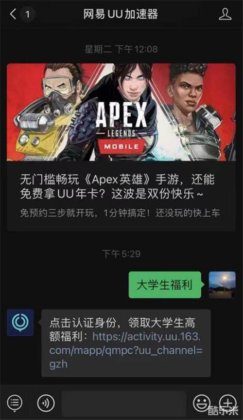 第一步:前往网易UU加速器官方公众号,回复“大学生福利”