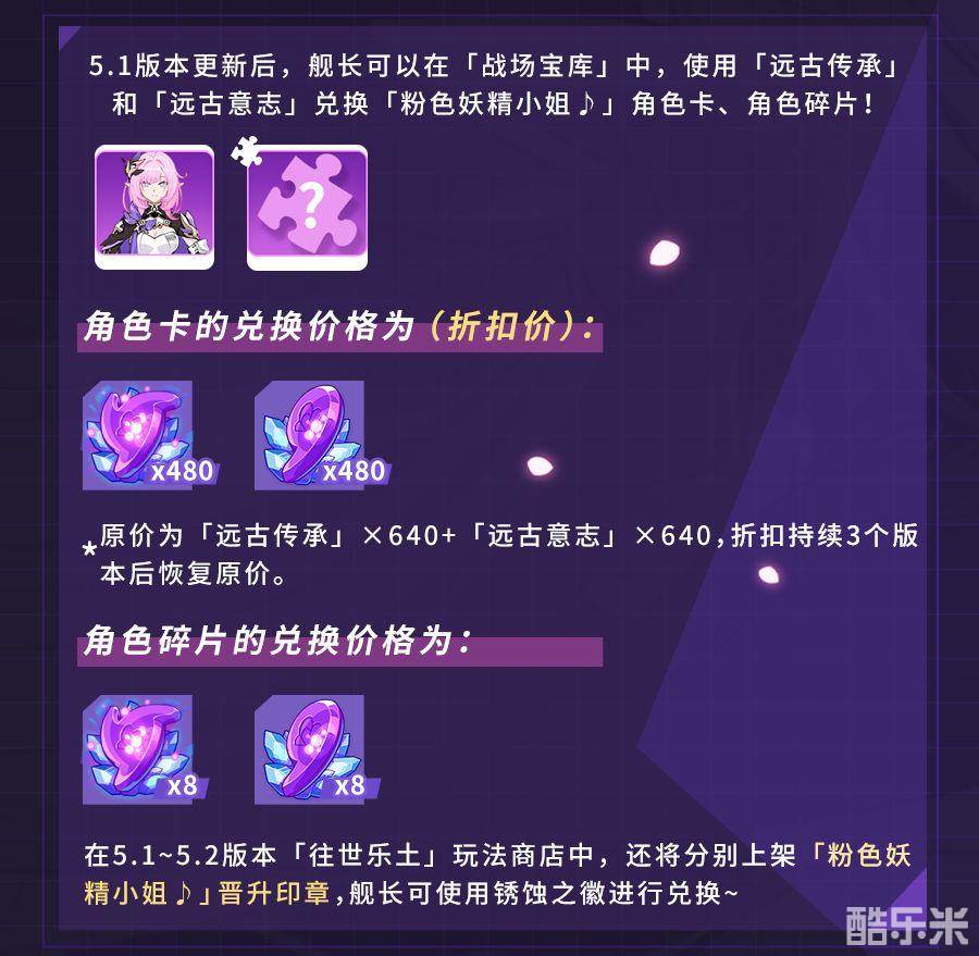 5.1版本开启后,舰长可以使用「远古传承」、「远古意志」兑换新角色「粉色妖精小姐♪」整卡与角色碎片。