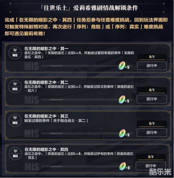 1、在剧情玩法中通关「在无限的暗影之中」系列任务,并参与任意难度的挑战关卡,再次回到活动界面出发特殊剧情对话,然后再次进行「序列:危险」或「序列:真实」的挑战就可以挑战我们的版本最强boss爱莉希雅了。