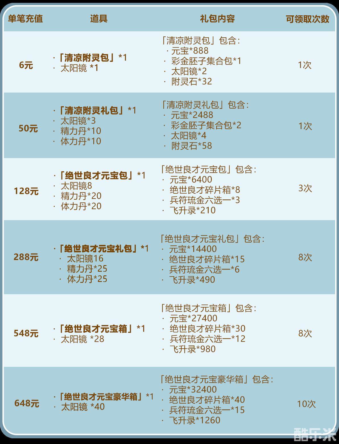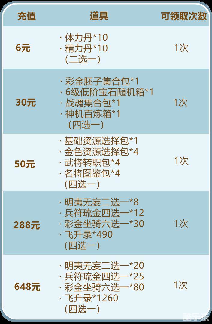 在活动期间少年们单笔充值至指定金额,即可获得元宝、绝世良才碎片箱、兵符琉金六选一、飞升录、太阳镜等资源: