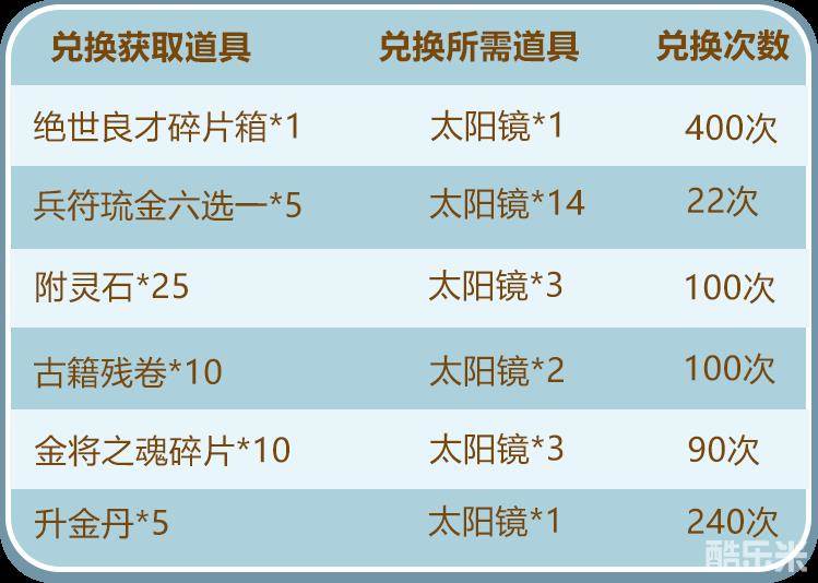 「太阳镜」可用来兑换绝世良才碎片箱、兵符琉金六选一等稀有资源: