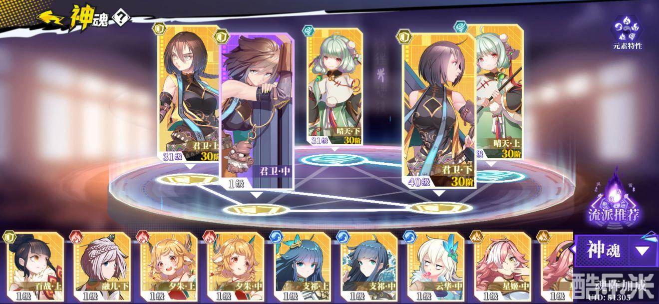 3君卫+2晴天,君卫是为了提升防御属性,晴天是为了提升伤害加成。因为防御灵器有一件自带闪避+残影闪避靴能很好的维持晴天的层数,保证100%的伤害加成。