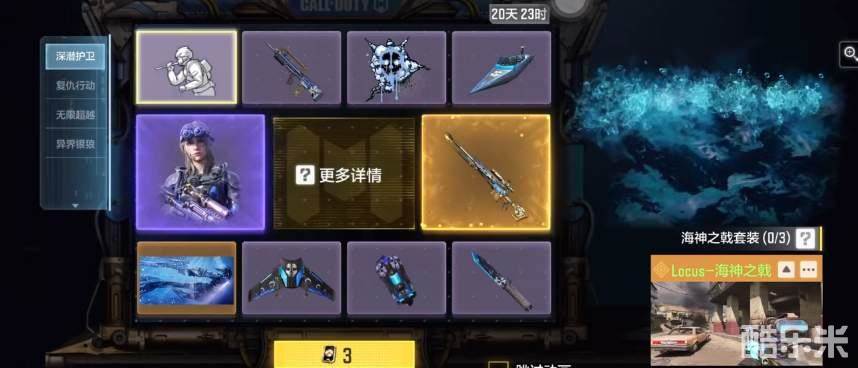深潜护卫转盘如下图所示,其中的奖励都是深海主题的,比较值得关注的就是新角色深潜护卫雅莉丝,以及专属的枪械传说级Locus-海神之戟蓝图。