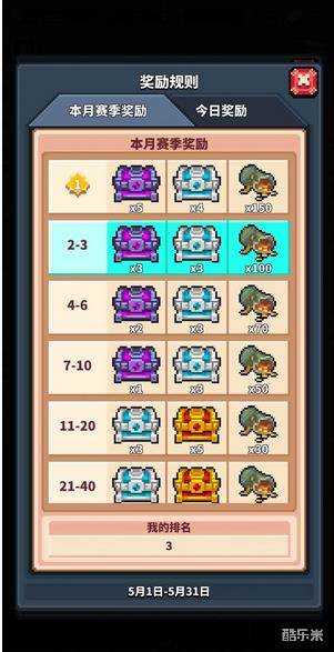 在竞技场挑战后,便可以来到天命之碑查看当前的排名,同时领取奖励。每天均会根据当前排名,得到对应的奖励;在月末赛季结束时,同样会得到根据排名得到赛季奖励。因此即使是为了奖励,小矿工们也要勇敢地在竞技场中战斗哦。